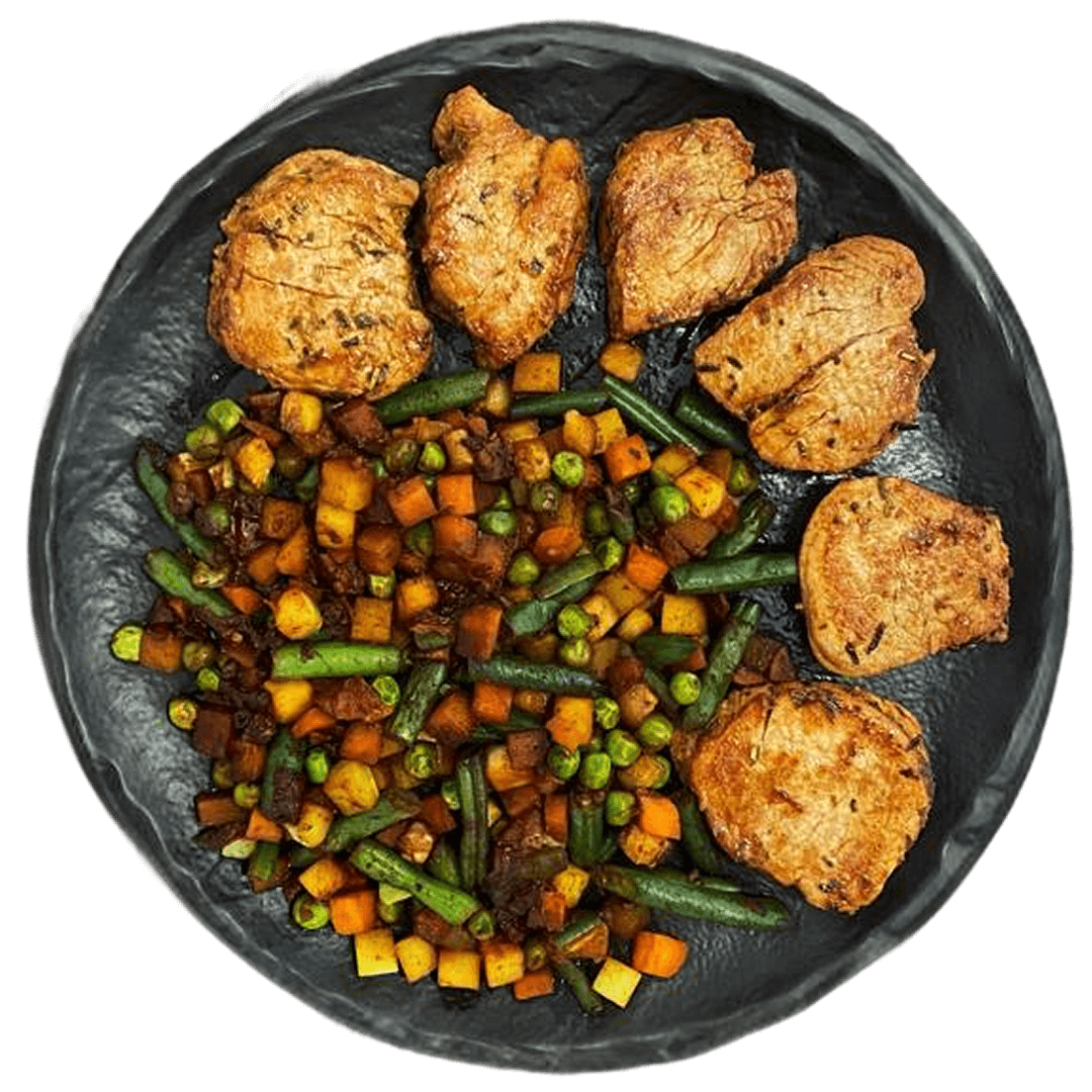 - Текстура: мясная от свиных медальонов, волокнистая от овощей.