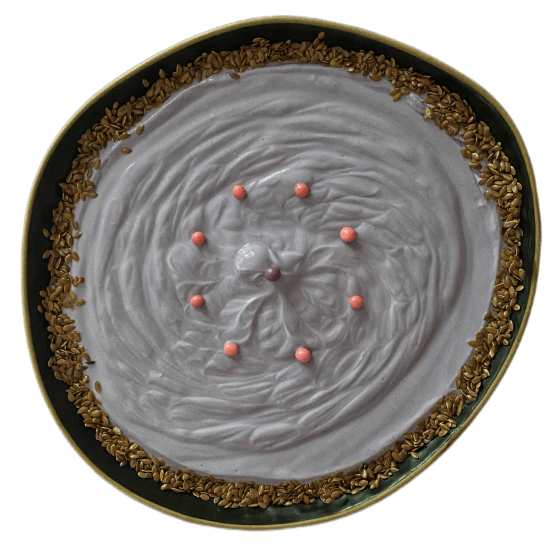 Вариация пуддинга-конструктора. Ощущается как сладкий йогурт из магазина, но значительно больше белка и меньше калорий на 100 грамм. Добавлен сахарозаменитель, низкокалорийный карамельный топпинг и декор в виде семян и посыпки. Использован греческий йогурт бренда «Простоквашино» и фиолетовый пищевой краситель.