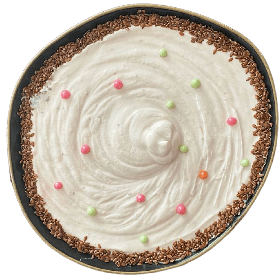 Для декорирования семенами удобно использовать ложку с носиком. Сперва набрать в нее семена, затем направить к грани тарелки и перемещать по кругу, одновременно постукивая по ложке пальцем. Чтобы разместить посыпку более точно, удобно использовать кулинарный пинцет. На этом процесс завершен, блюдо готово к употреблению!