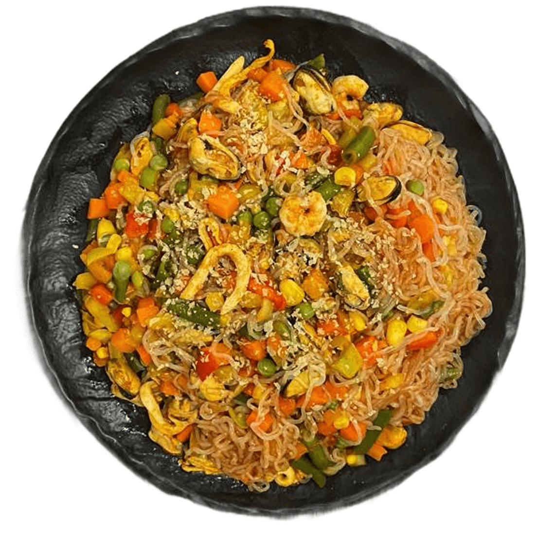 Вариация Wok-конструктора: гарниром выбраны ширатаки и овощная смесь, источником белка — морепродукт.