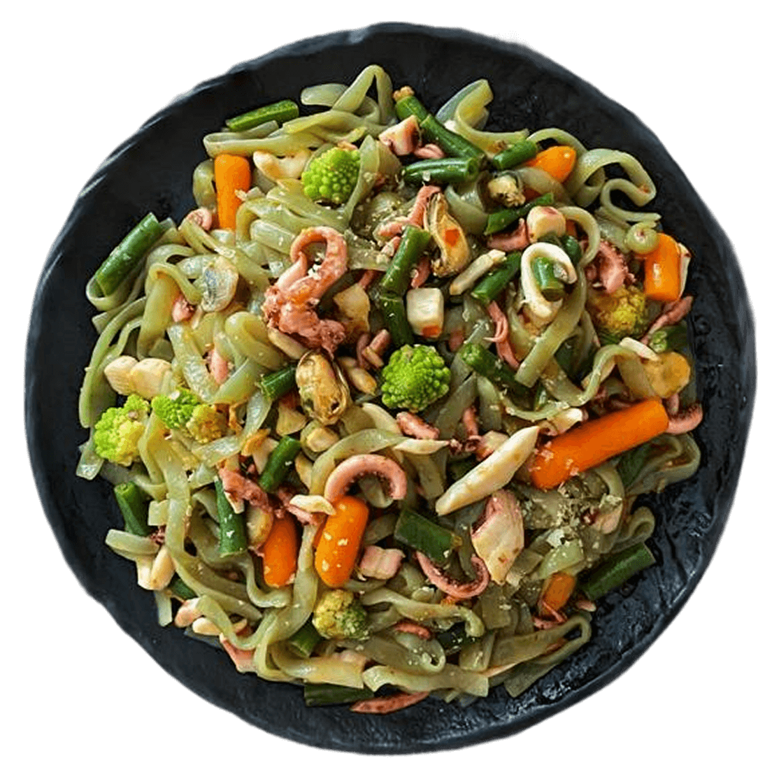 Вариация Wok-конструктора: гарниром выбраны ширатаки и овощная смесь, источником белка — морепродукт.