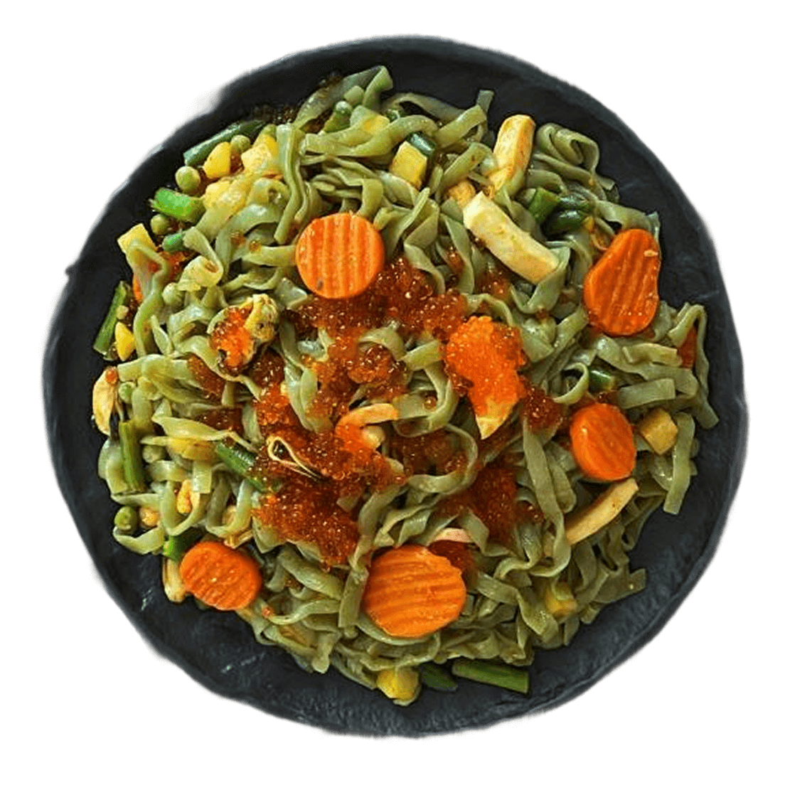 Вариация Wok-конструктора: гарниром выбраны ширатаки и овощная смесь, источником белка — морепродукт.