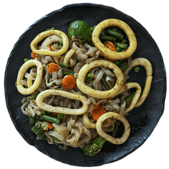 Это вариация блюда «Wok из фетучини ширатаки с овощами и кальмарами»