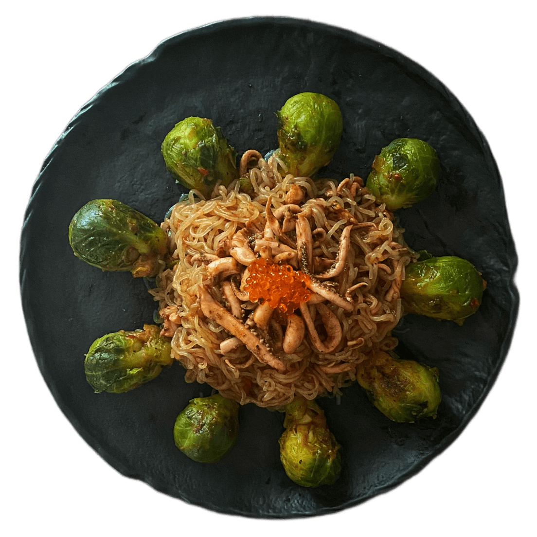 Вариация Wok-конструктора: гарниром выбраны ширатаки и овощная смесь, источником белка — морепродукт.