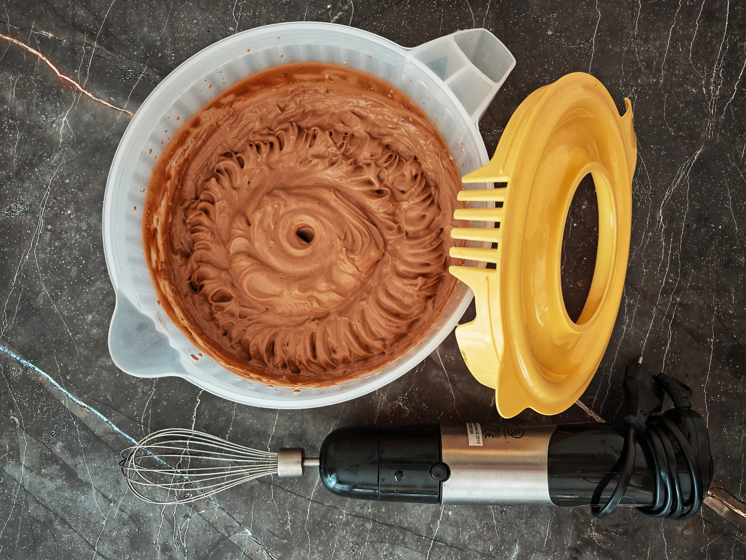 Переместите все ингредиенты, кроме гуаровой камеди, в одну емкость. Последовательность не принципиальна. На взбитие белка это значимо не влияет.
